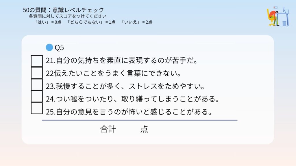 メモを用意して、下の50問にスコアをつけて下さい。